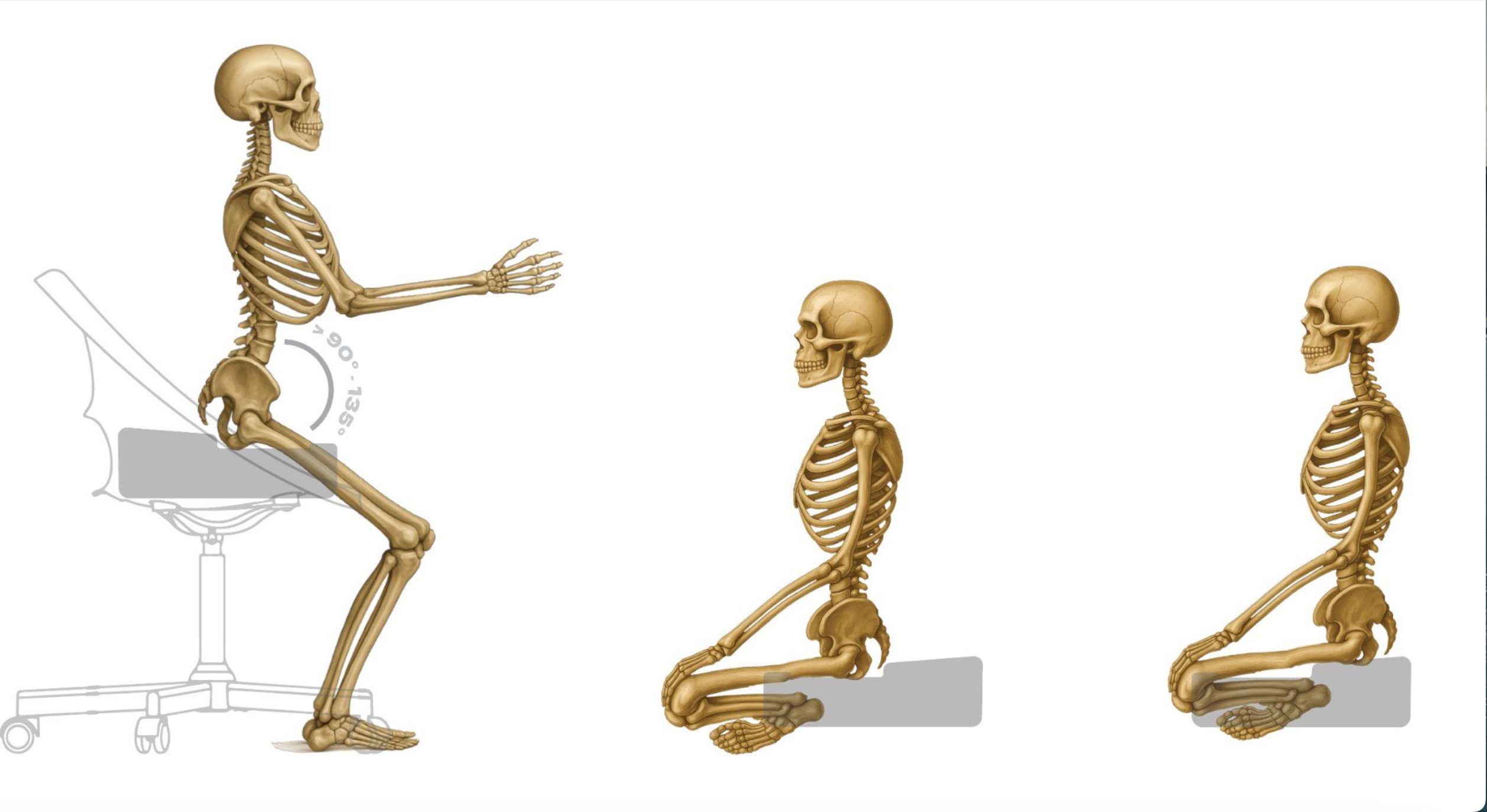A common issue with most chairs, no matter how ergonomic, is the seat tilt. Most chairs have a slight backward tilt, lowering your hips below your knees. Even a few degrees of tilt affects posture and breathing. When your knees are higher than your hips: